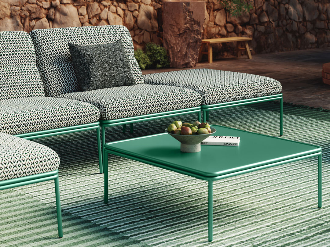 Sattes Grün, grafisches Muster: schlanker Metallrahmen mit feiner Gurtung. Ein Outdoor-Sessel, der leicht wirkt und trotzdem Präsenz hat.