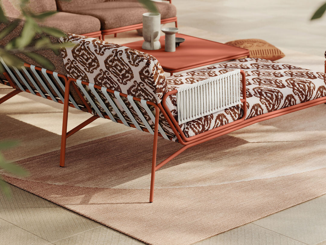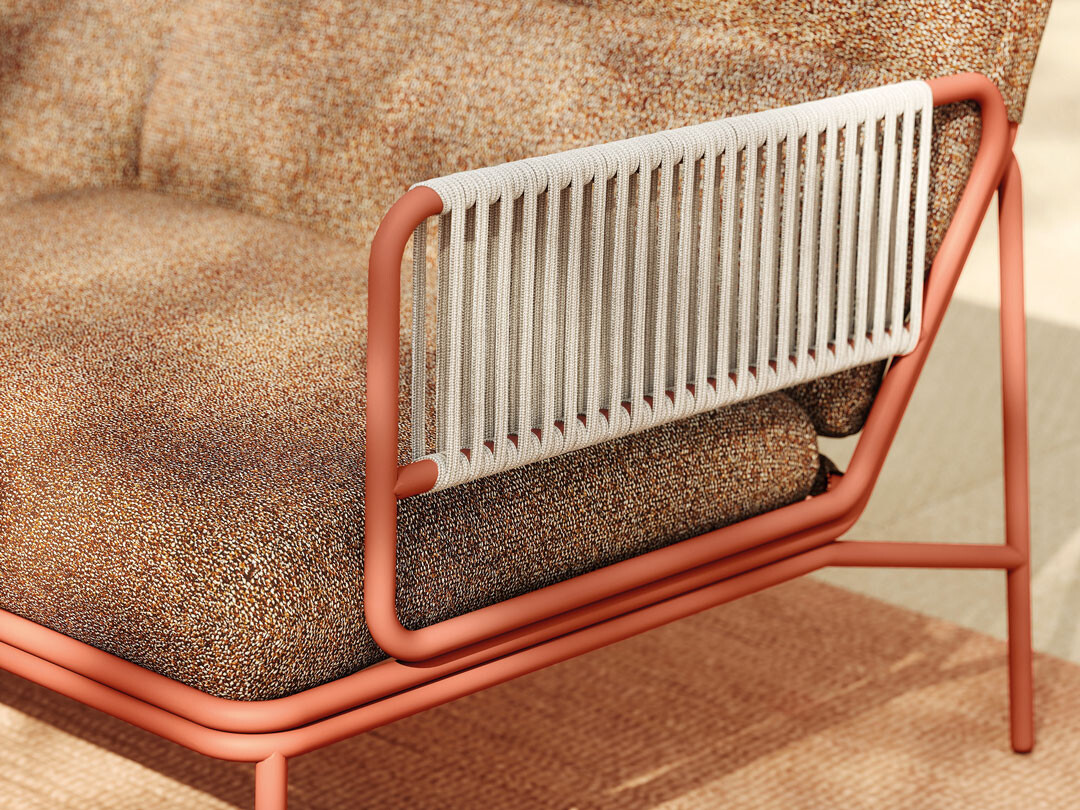 Zartes Design, wetterfest beschichtetes Edelstahlgestell, hochwertige Sitzpolster& offene Gurtung als Blickfang.