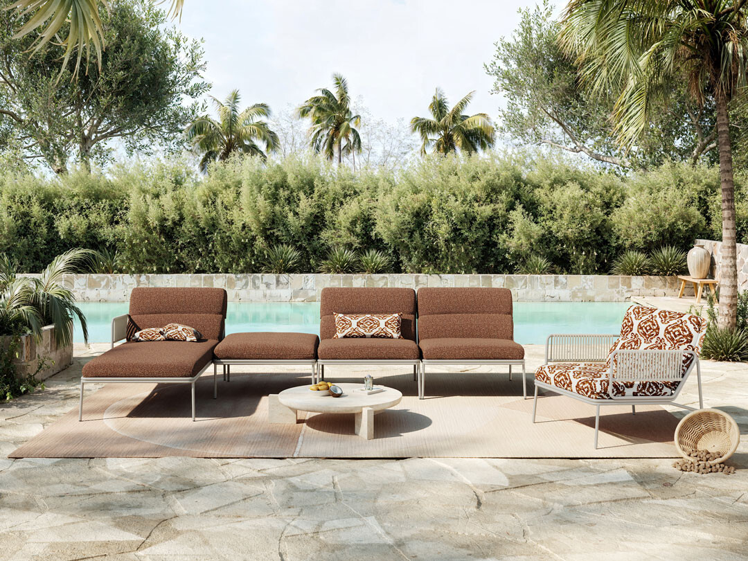 Flexibel, ästhetisch & zeitlos: Helle, ruhige Töne und eine klare Linienführung lassen dieses Sofa leicht wirken – fast wie drinnen, nur für draußen gemacht.
